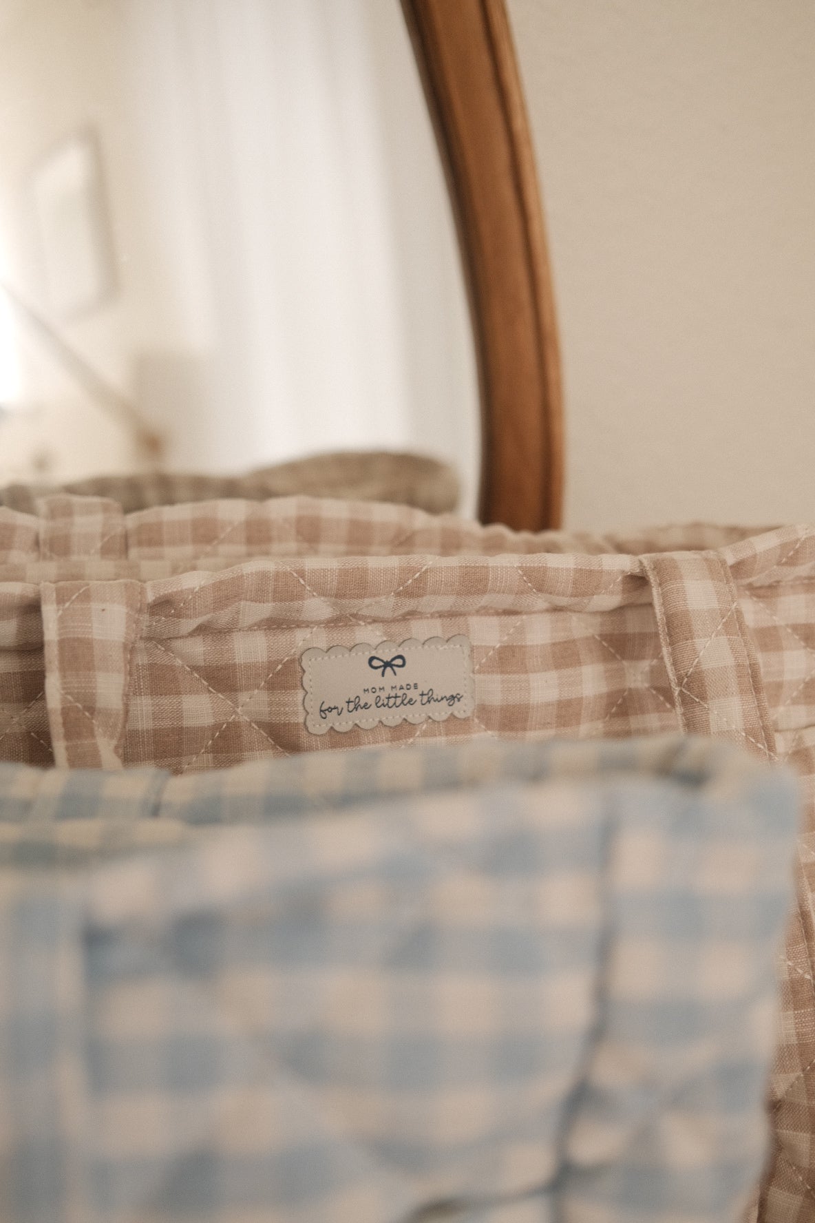 Meet the bag that carries it all — from newborn days to every fun chapter that follows. Thoughtfully designed for practicality, comfort, and charm, our Everyday Mama Bag is spacious, soft, and stylish in a blue-and-beige gingham cotton–linen blend.